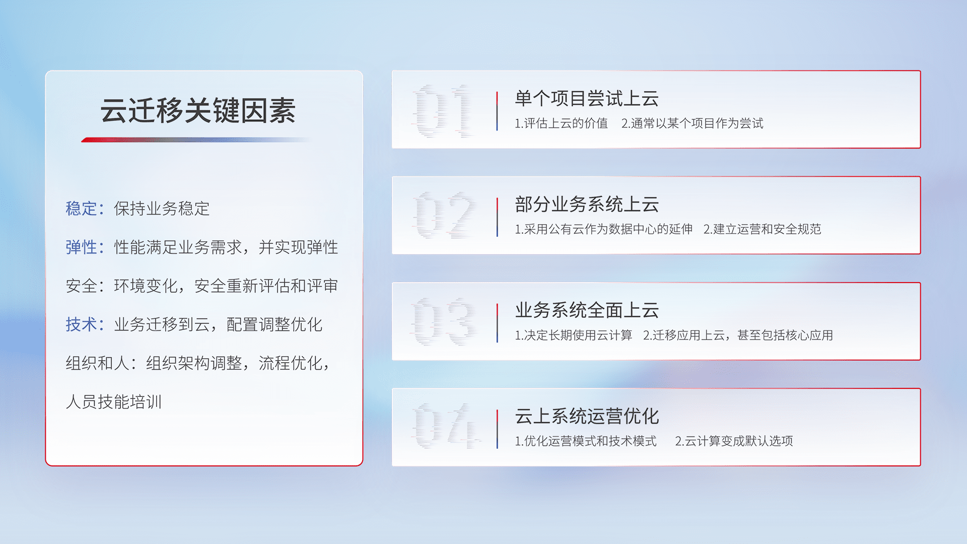 结合实际业务,,从规划设计、、、、云平台选型、、云原生改造、、、数据迁移、、、集成交付,,,迁移全过程为客户识别最佳上云路径,,,,做好风险识别管理,,,,设计网络架构、、身份权限、、、安全审计合规、、、、操作审计、、、日志审计、、、、监控告警策略、、、多站点容灾设计等,,,对云上基础设施进行整体规划,,,,提升IT治理水平,,,,以满足弹性、、、、高可用、、、、高性能的需求。。。