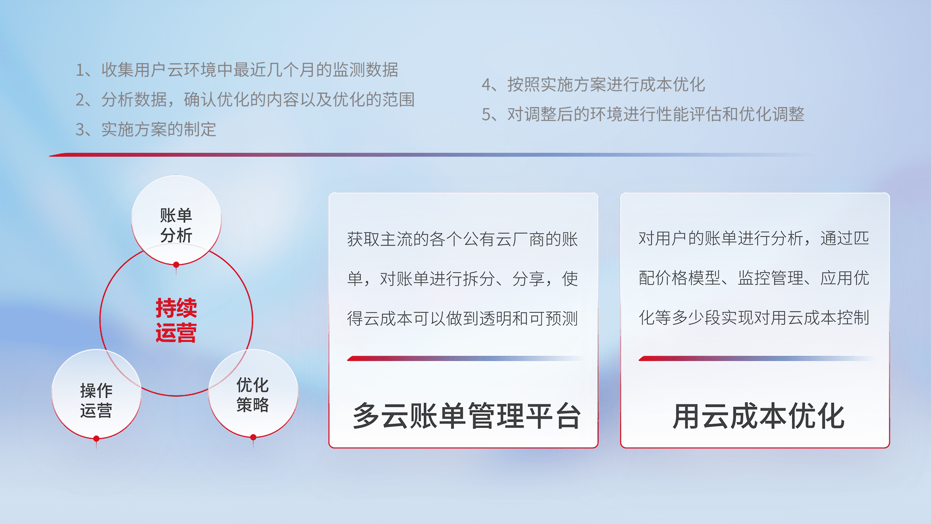 通过多云纳管,,以统一的资源数据模型把客户的云资源进行抽象和封装,,进而实现对多云资源的统一操作,,,,保障云资源管理的可靠性、、稳定性与可用性。。。。量身定制化运维内容,,,,配置、、开发运维、、、、补丁管理、、、备份、、监控、、认证和访问管理、、、审计和日常巡检等,,,,保障在用云过程中的可靠度,,,,稳定度以及高可用率。。