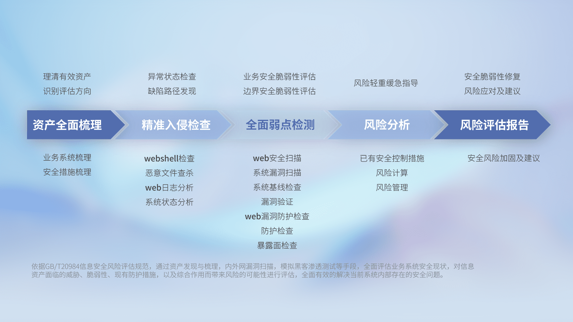 针对客户行业特性,,以专业的安全服务+多厂商联合解决方案提供专属的一站式安全管理服务,,,,帮助客户全面感知网络空间威胁,,,基于识别、、检测、、分析、、防护、、、监测、、响应的服务理论模型,,,,从方案咨询、、、、集成交付、、评估验证、、、优化加固、、、运维运营,,致力于为客户提供完整的闭环管理式安全服务。。。。以实战经验为客户打造高抵御风险的安全体系,,帮助客户发现威胁、、对抗威胁、、、、处置威胁,,,,不断积累安全对抗能力,,,持续保障数字化安全。。。。