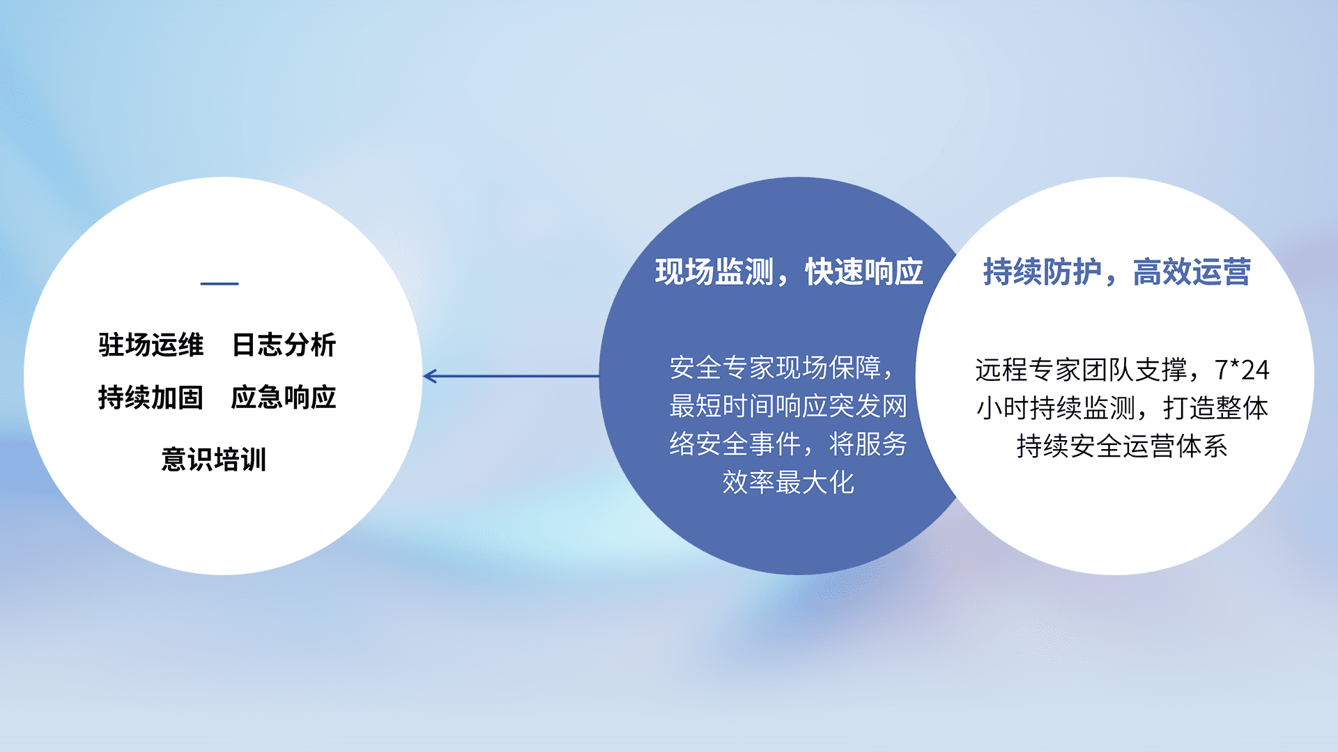 针对客户行业特性,,,,提供专属的一站式安全管理服务,,,,帮助客户全面感知网络空间威胁,,,通过安全专家的线上、、、线下防护支持,,,,实现风险闭环,,,,将安全保障常态化,,,为客户打造常态化安全运维运营服务。。。